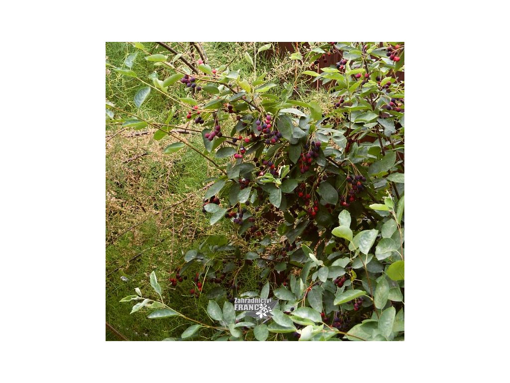 Vzhled: Vzpřímeně rostoucí, výběžkatý keř, zřídka vícekmenný strom. Listy jsou oválné ostře pilovité, v mládí bělavě plstnaté, 2,5-5 cm dlouhé. Mladé listy a výhony jsou na jaře bronzové a postupně přechází do sytě zelené barvy. Podzimní vybarvení listů je žlutavě oranžové. Květy jsou bílé, větší 2-2,4 cm v průměru, samosprašné, medonosné, uspořádané po 3-7 ve vzpřímených, plstnatých hroznech, kvete v květnu. Plod je malá malvička, kulovitá, tmavě modrá až černá, ojíněná, 8-10 mm v průměru. Plody vyrůstají v řídkých hroznech, jsou měkké, jedlé ale mdlé. Keř přirůstá ročně 15-35 cm, běžně dosahuje výšky 1,8-3 m.