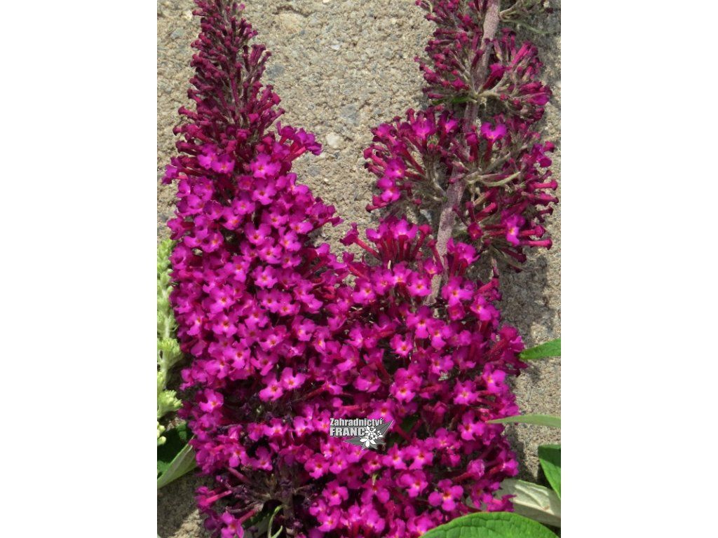 Vzhled: Vystoupavě, později až rozložitě, rostoucí keř. Listy jsou protáhle vejčité s delší špičkou, vstřícné, slabě chloupkaté, jasně až stříbřitě zelené, na rubu bělavě zelené, plstnaté. Drobné trubkovité květy jsou uspořádány do vzpřímených až mírně převislých klasů dlouhých 15-40 cm. Odrůda s květy nápadně vínově červenými, intenzivně voní. Květy maji korunu široce miskovitou a silně zvlněnou a takže dobře vyplňují květenství a jsou bohatým zdrojem nektaru. Díky tomu jsou oblíbeným zdrojem potravy motýlů = motýlí keř. Kvetení začíná od konce června a pokračuje až do začátku září. První klasy v červnu jsou nejmohutnější, později v létě jejich velikost klesá asi o1/3 - klasy na bočním obrostu. Keř roste středně bujně, roční přírůstek je 25-45 (60) cm, rostlina dosahuje 20. rok po výsadbě výšky 1,8 až 2,2 m. Starší keře mohou dorůstat výšky i přes 2,5 m, většinou však u nás pravidelně namrzají a následně je nutný hluboký zmlazovací řez až 10 cm nad zemí. Proto u nás keře obvykle nedosahují takových velikostí jako v Anglii nebo Holandsku.