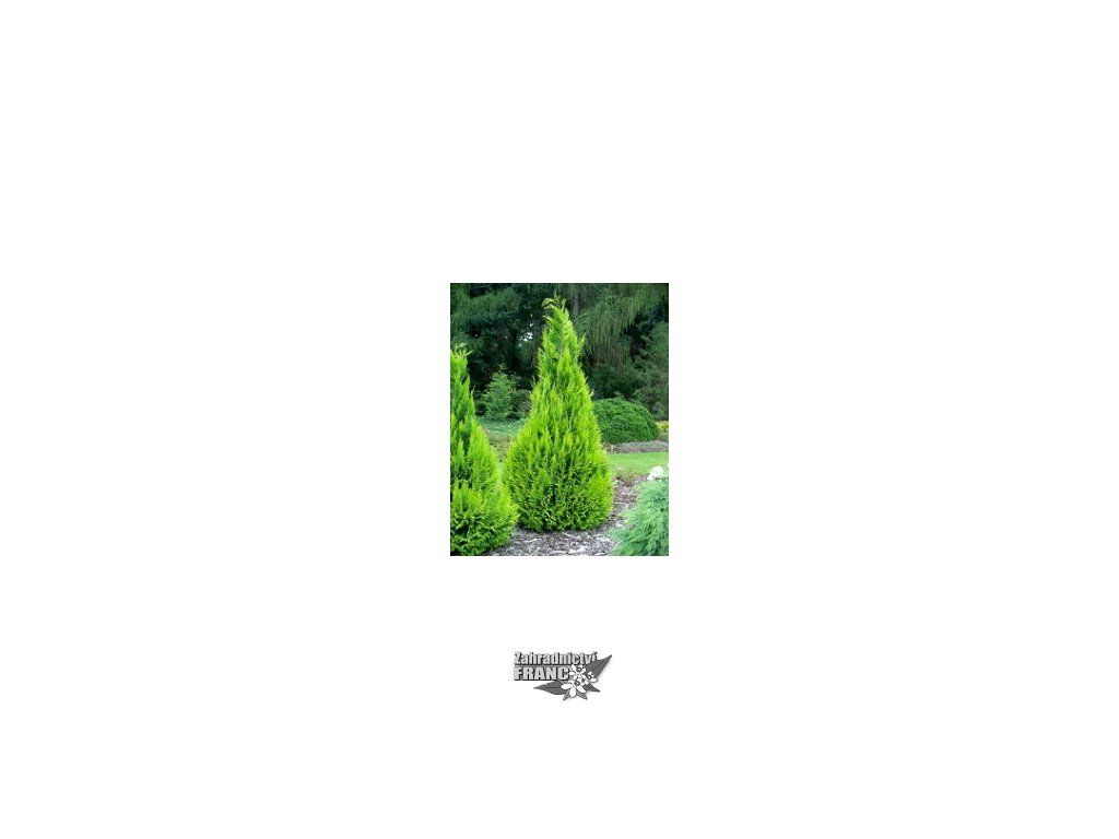 Vzhled: Koruna úzce kuželovitá, hustě větvená, větve ploché, jehlice šupinovité, světle zelené, na koncích zlatožluté, k bázi poněkud žlutozelené, příjemně voní. Barvu si uchovává i v zimě. Šišky kulovité, 8 -10 mm v průměru, dozrávají v srpnu až září. Strom dosahuje ve 20. roku výšky 4-5 m, dospělé stromy dosahují kolem 60. roku výšky 10 až 14 m.