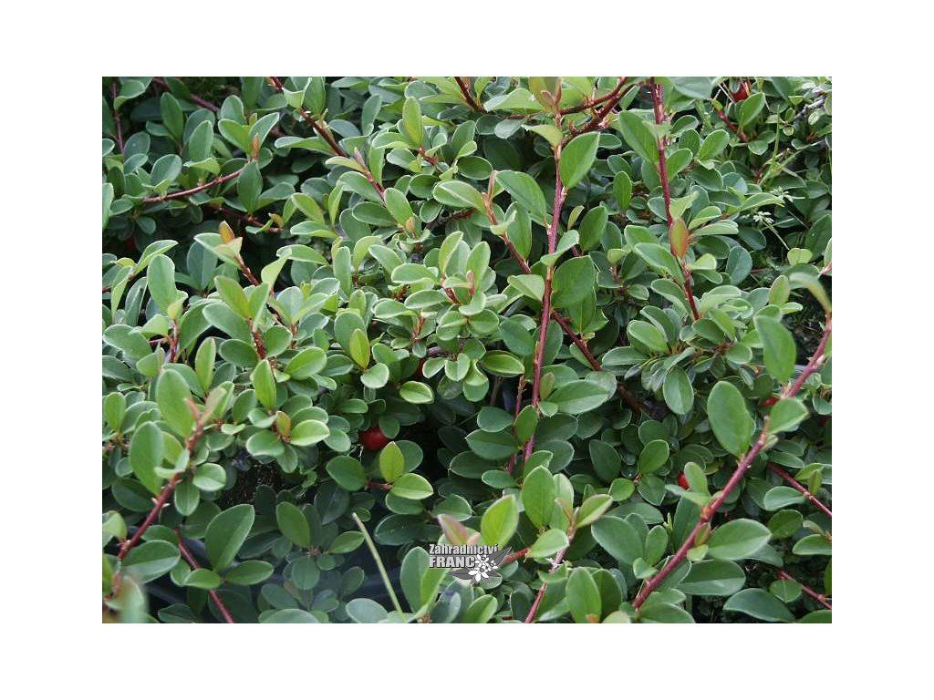 Vzhled: Středně až bujně rostoucí poléhavý keř. Listy jsou tmavě zelené, vejčité s oblou špičkou, mírně lesklé, délka 8-15 mm, neopadavé. Větvičky se hustě větví a vytváří pravidelné obloukovité výhony, snadno přikořeňují. Květy jsou bílé někdy slabě narůžovělé, drobné, 10-15 mm v průměru a objevují se na přelomu května a června. Plody jsou jasně červené, kulaté a dozrávají od září do listopadu. Roční přírůstek je 20 až 40 cm, rostlina pokryje plochu o průměru 1,5-2,0 m a nepřesahuje výšku 25-30 cm.