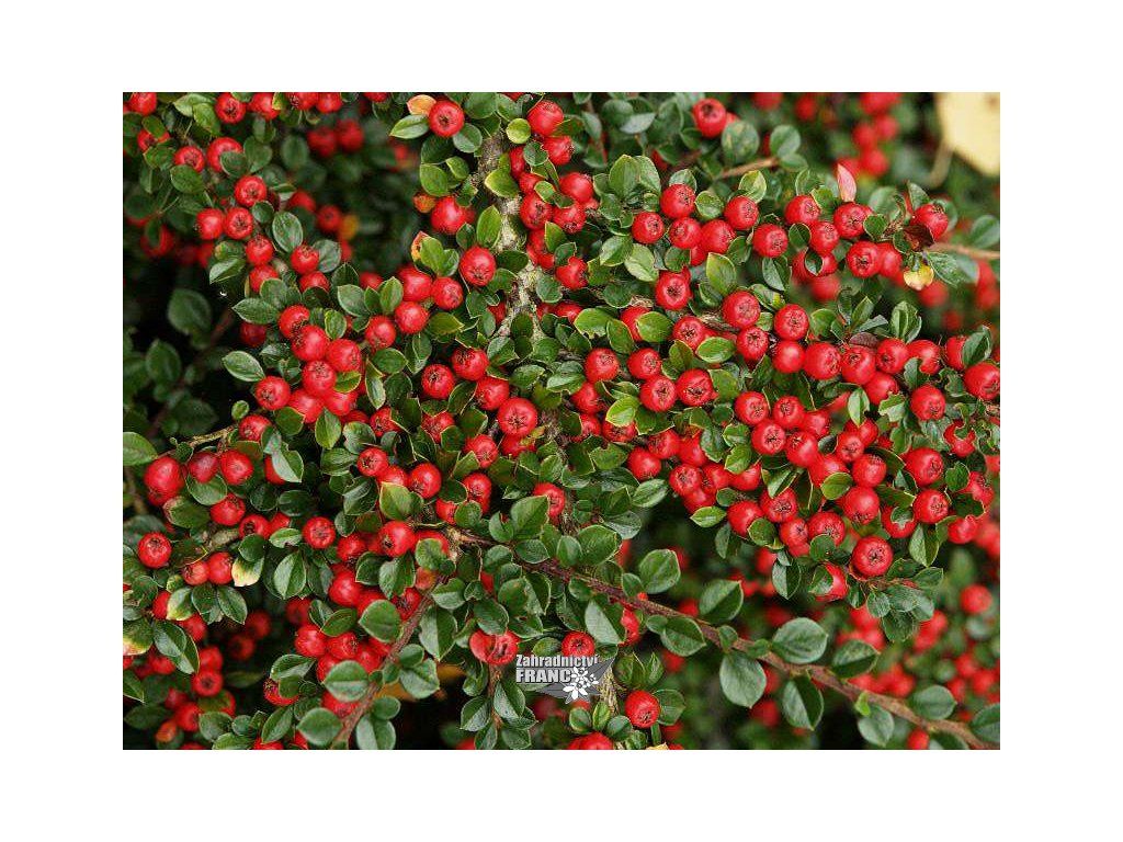 Vzhled: Středně rostoucí rozložitý až poléhavý keř. Listy jsou sytě až tmavě zelené, lesklé, široce vejčité s ostrou špičkou, délka 5-12 mm, opadavé, na podzim vybarvují jasně oranžově až červeně. Větvičky se hustě a vodorovně větví, silné výhony po rozvětvení připomínají rybí kostru. Květy jsou slabě narůžovělé, drobné, 10-15 mm v průměru a objevují v květnu. Plody jsou jasně červené, kulaté a dozrávají od srpna do září a na rostlině často drží až do prosince. Roční přírůstek je 25 až 50 cm, rostlina dorůstá výšky 1-1,2 m a pokryje plochu o průměru 1,5-2 m.