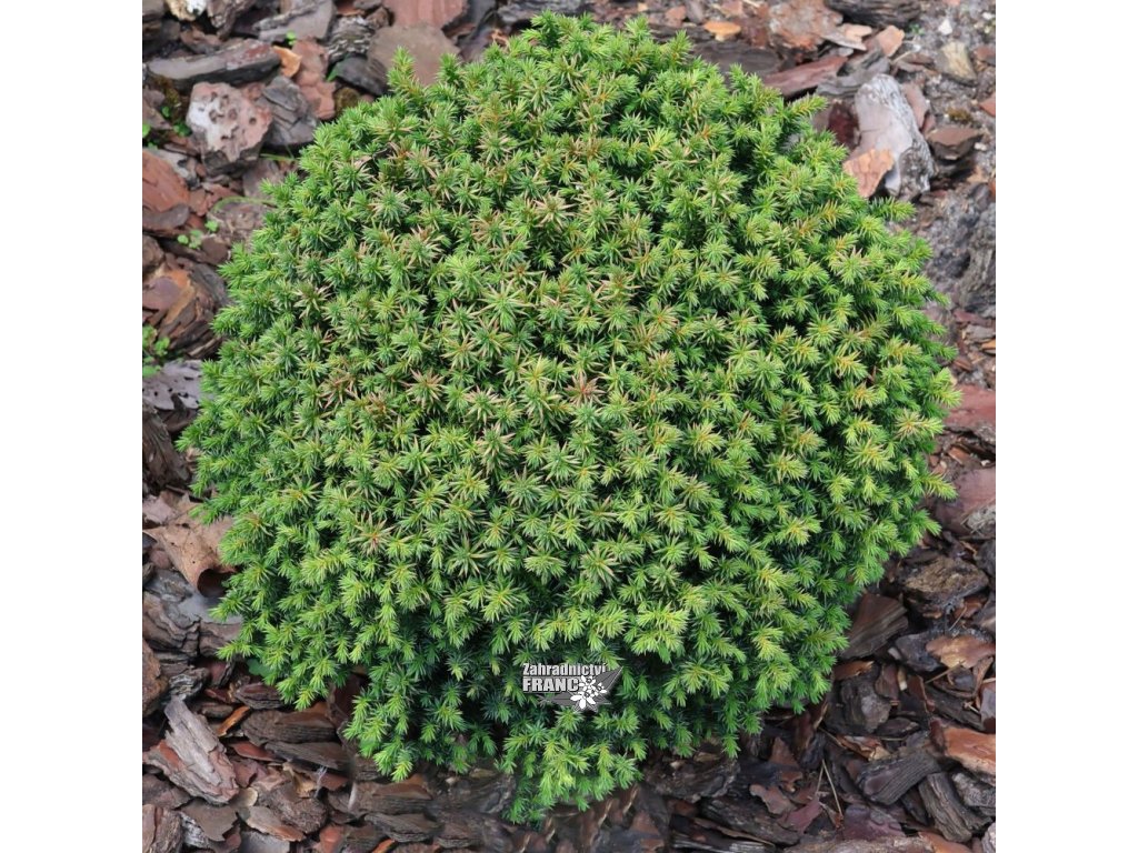 Vzhled: Růst je široce kulovitý. Větve jsou husté, kompaktní. Jehlice jsou drobné, krátké, sytě až tmavě zelené, na zimu vybarvují výrazně červenohnědě. Roční přírůstek je 6-12 cm, výška ve 10. letech je 40-50cm, šířka 40-50 cm.