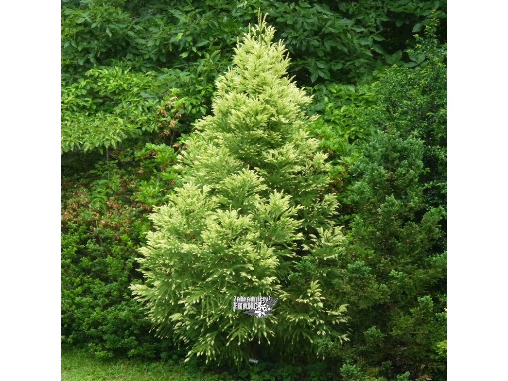 Vzhled: Růst je pravidelně kuželovitý. (Pokud jako mladá rostlina rychle vyroste, je nutný tvarovací střih během jara.) Větvení je krátké, tuhé, mírně převislé, husté. Hlavním lákadlem je sytá krémově zlatá barva, která se objevuje v druhé polovině léta. Jehlice drobné, krátké, sytě až sivě zelené, na koncích zlatavě žluté, na zimu vybarvují mírně do vínově-hnědé barvy. Roční přírůstek je 30-35 cm, výška v 10. letech je 3-5 m, šířka 2-3 m, starší rostliny mohou v příznivých podmínkách dorůst až do 8 m.