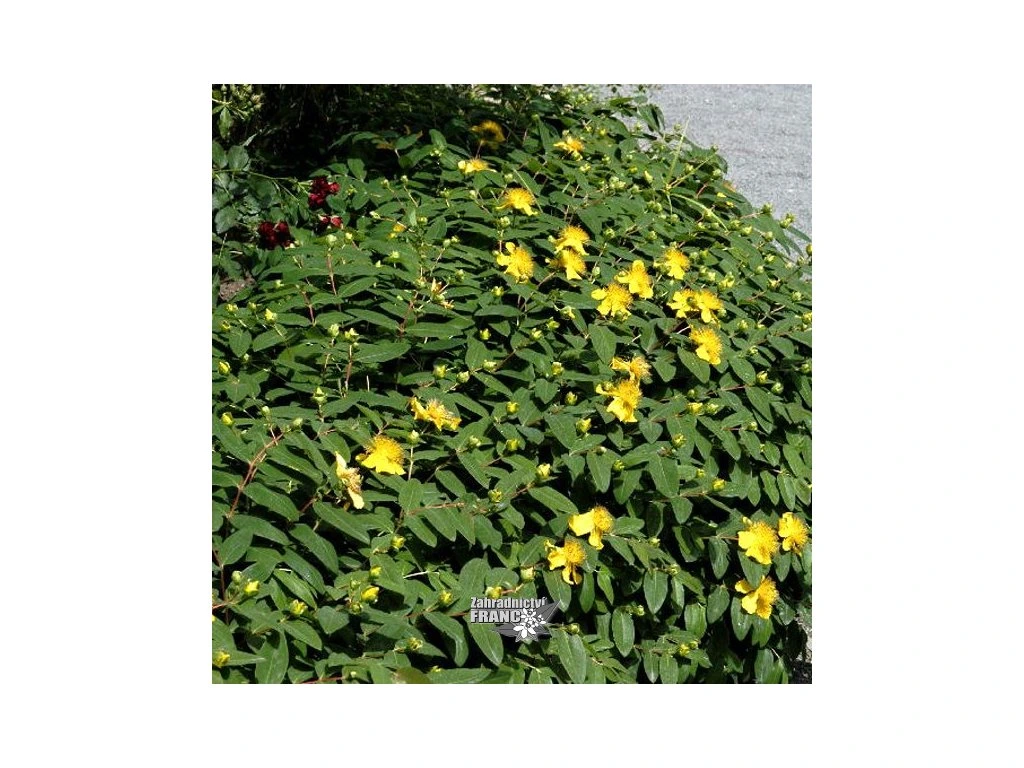 Vzhled: Vystoupavý stálezelený keřík s velmi bohatě odnožujícími oddenky, vytváří souvislý kobercový pokryv. Výhony dorůstají výšky 30-40 cm, listy jsou vstřícné, jasně zelené, oválné s tupou špičkou. Květy tvoří na koncích letorostů, jsou jasně žluté, pětičetné s velkým množstvím nápadně dlouhých tyčinek, obvykle 5,5-7 cm v průměru. Kvete postupně na vrcholech letorostů od července až do září. Roční přírůstek je 20-30 cm, nadzemní části výhonů namrzají při déletrvajících holomrazech pod -20°C, takže u nás tvoří nižší kobercové porosty obvykle vysoké 20-30 cm, při mírných zimách ovšem může dosáhnout výšky až 50 cm.