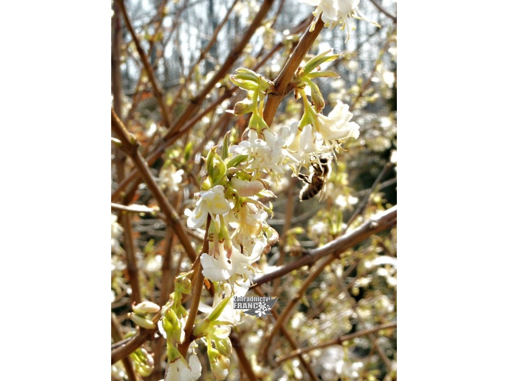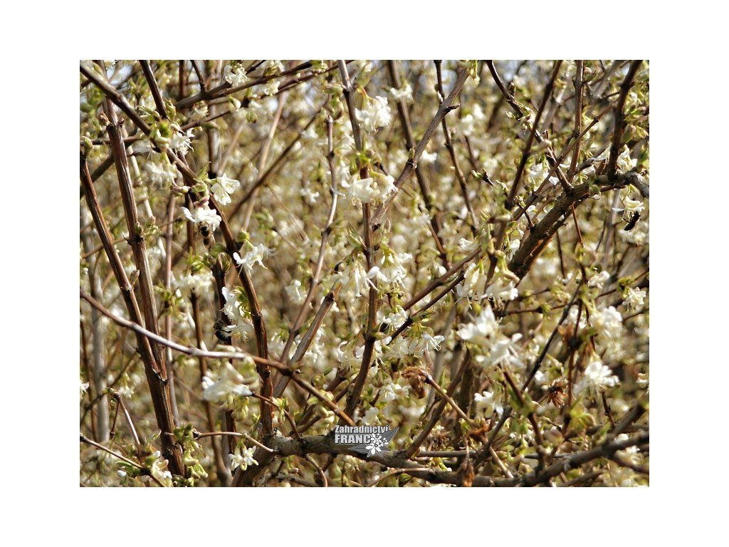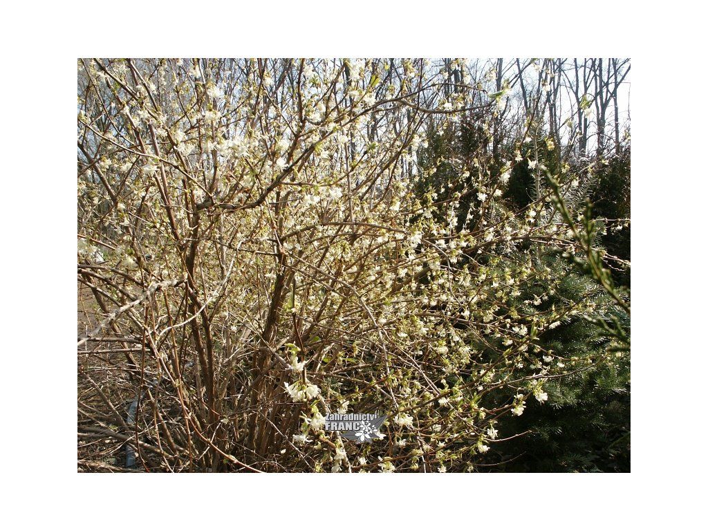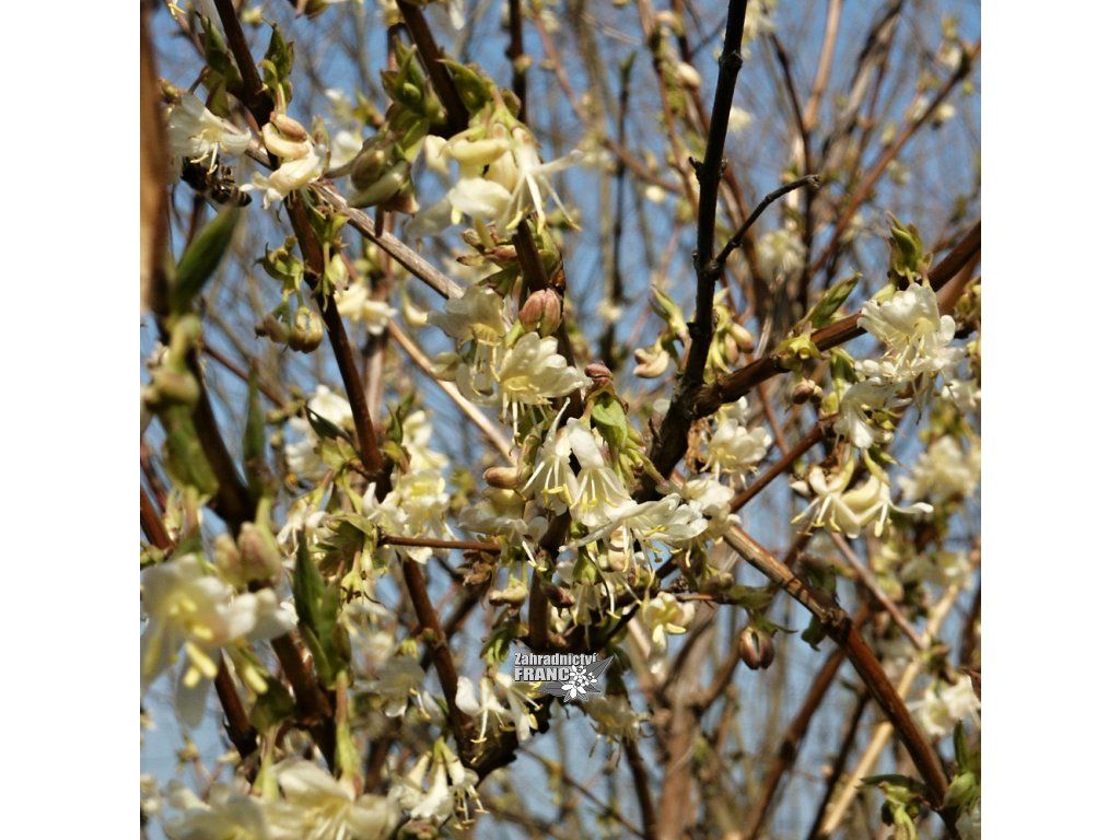 Vzhled: Středně až bujně rostoucí keř. Listy vejčité s výraznou špičkou a červeným až fialovým řapíkem, sytě zelené, vstřícné a polo-opadavé. Květy jsou bílé, výrazně vonné. Kvete brzy, na konci března až první polovina dubna, před olistěním, je botým zdrojem nektaru. Plody jsou jasně červené a dozrávají již v červnu až červenci. Roční přírůstek je 60 až 80 cm, výška kolem 20. roku po výsadbě 3 až 4 m.