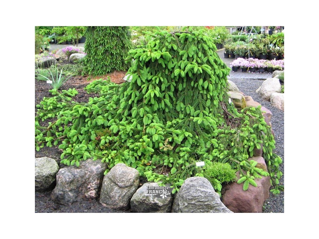 Převislý smrk, výška podle tvarování 1,5-3,0 m. Všechny větve volně převisají a tvoří sytě zelený závěs až k zemi. Pěkná solitéra v zahradách i parkových úpravách.