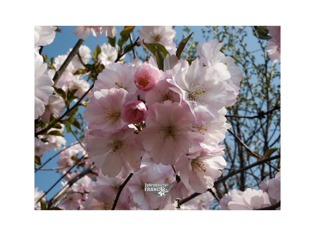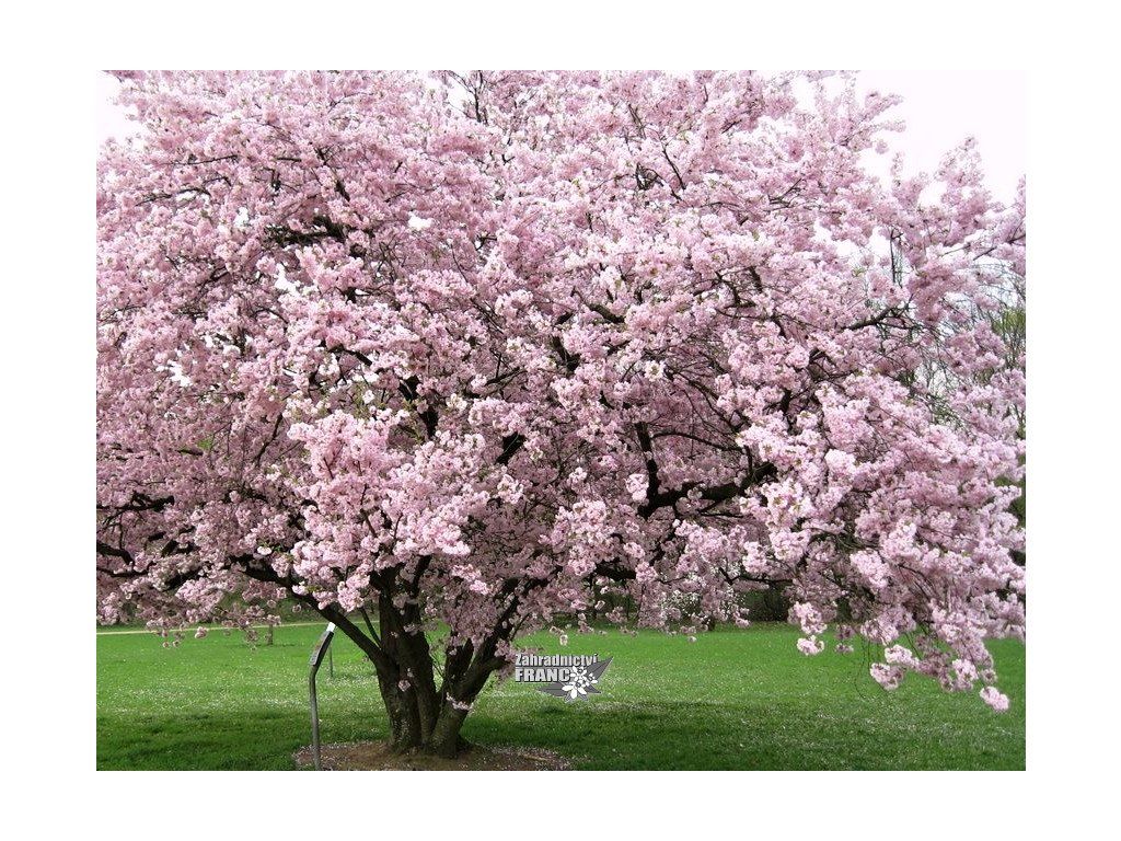 Vzhled: Opadavý, spíše pomalu rostoucí strom s rozložitou až ploše kulovitou korunou. Listy jsou střídavé, výrazně pilovité, sytě zelené; délka listu 5-8 cm. Květy střední, mají v průměru 3 až 4 cm, jsou světle růžové, složené z 12-15 květních plátků. Kvete velmi bohatě a brzy v druhé polovině dubna. Roční přírůstek je 20 až 30 cm, strom dosahuje v 10 letech výšky 2-3 m; v 25 letech výšky 3,5 - 5 m.