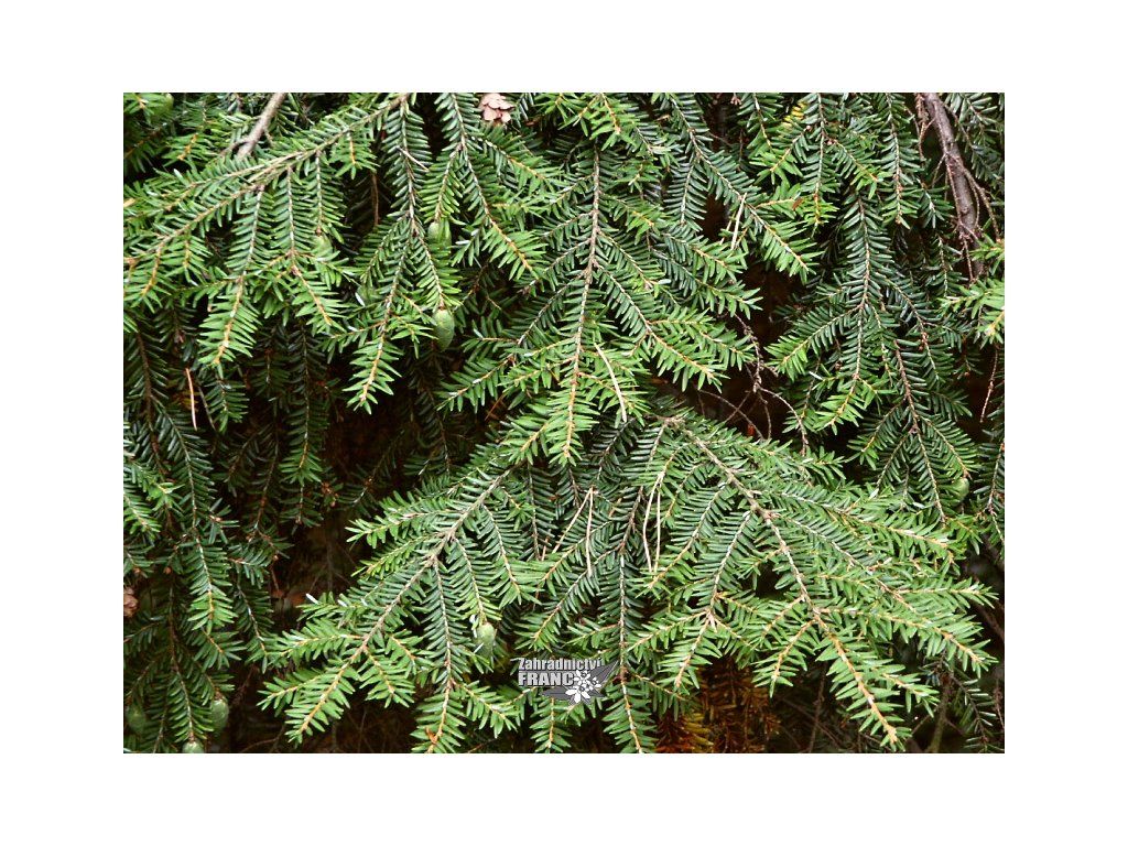 Vzhled: Středně rostoucí strom, koruna široce jehlancovitá. Působivý sytě zelený jehličnatý strom s jemným a převislým habitem. Jehlice jsou pravidelné ve dvou řadách, 8-15 mm dlouhé, lesklé, sytě zelené, na rubu mají dva bílé pruhy. široce vejčité, 10-15 mm dlouhé, Šišky krátce stopkaté, vejčité šedohnědé 15-25 x 12-15 mm. Dozrávají v říjnu až listopadu. Strom dosahuje ve 20. roku výšky 3-4 m, starší stromy dosahují kolem 50. roku výšky 6 až 8 m.
